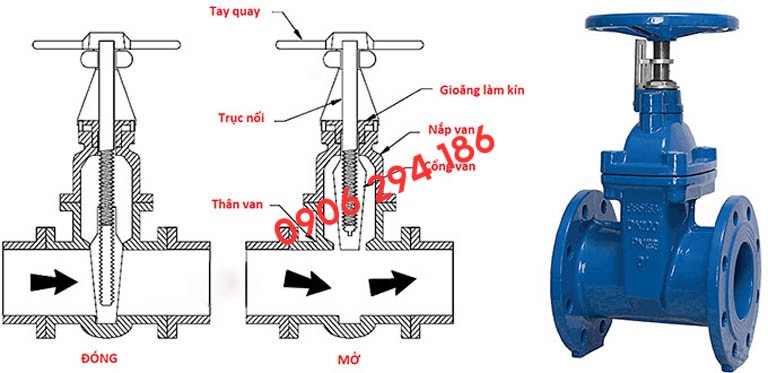 - Khi đóng van: Quay tay quay theo chiều ngược lại, trục ty hạ đĩa van xuống vị trí giữa thân van → chặn dòng chảy hoàn toàn.